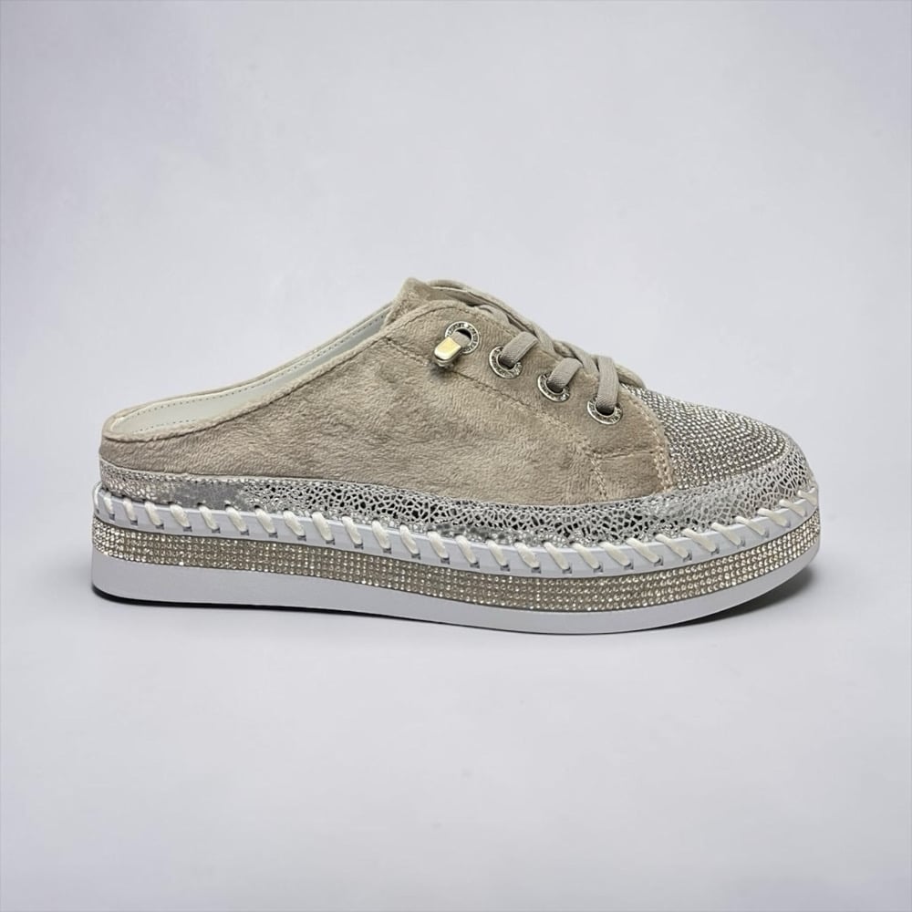 Velvet/ Leather upper. Rubber outsole. Slip on.