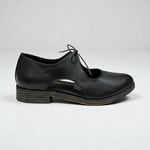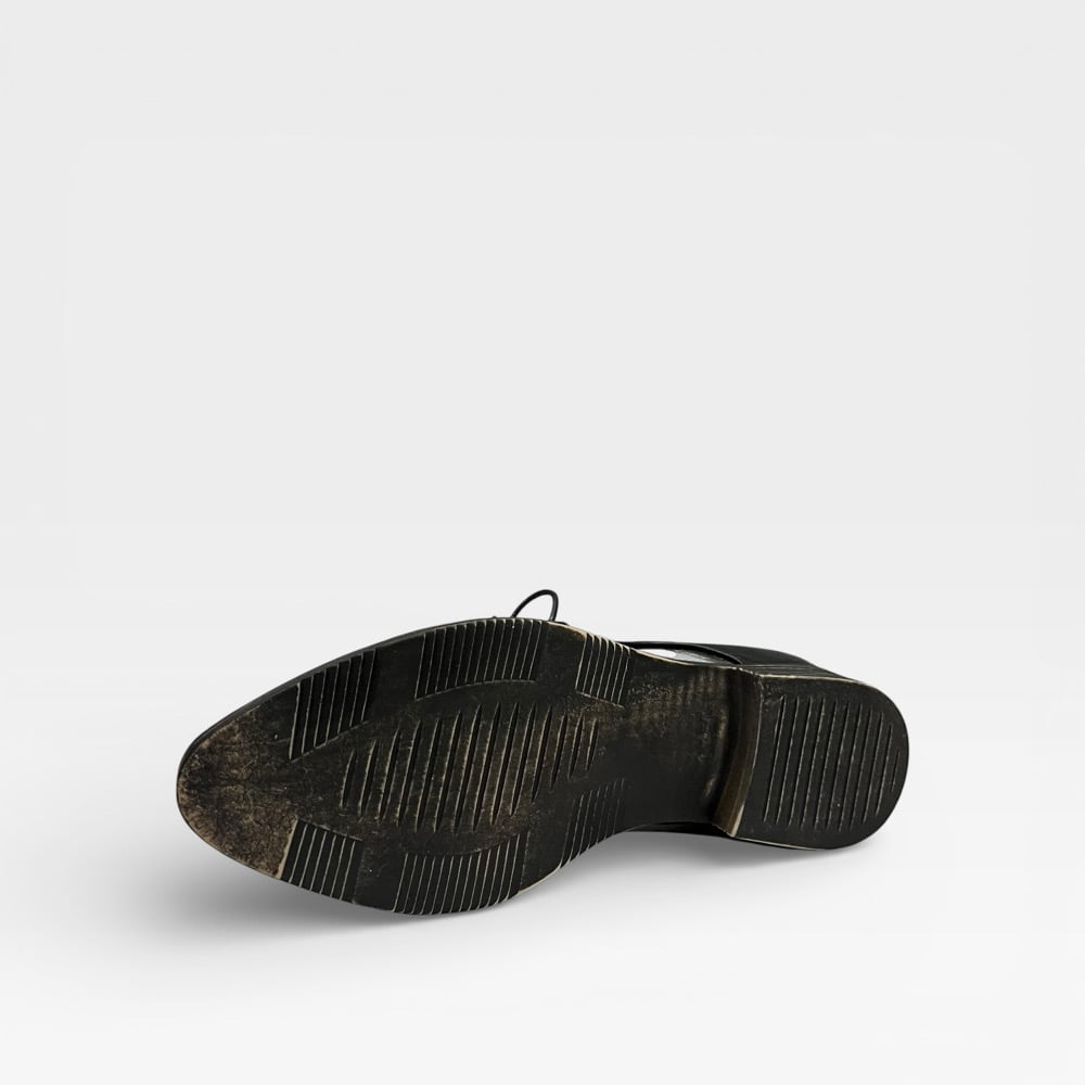 Leather upper. Leather lined. Slip on with adjustable lace. Rubber sole. $195