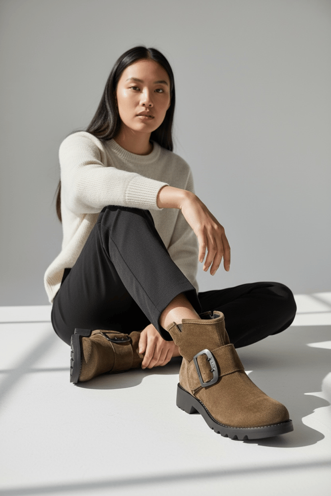 Pulled Suede leather upper. Drylex lined. Rubber outsole. Inside zipper entry.