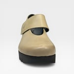 Leather upper. Leather lined. Rubber outsole. 2.5” wedge 1” platform. Velcro instep strap. $225