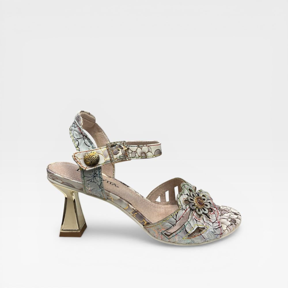 Leather upper. Leather lined. Rubber sole. Velcro ankle strap. 2.5” heel height. $165
