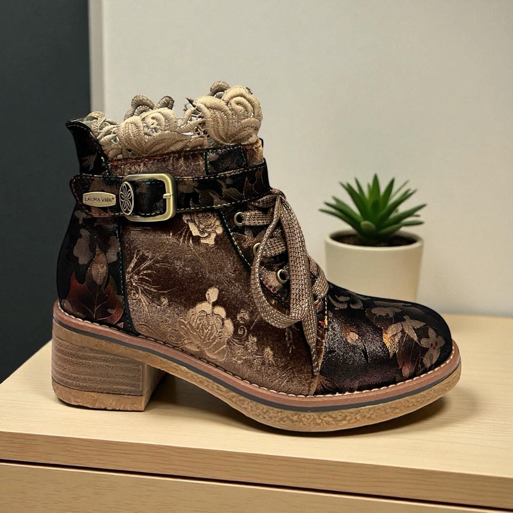 Leather upper. Microfibre lined. Rubber sole. Inside zipper. Adjustable laces. 2” heel. Reg price $225