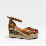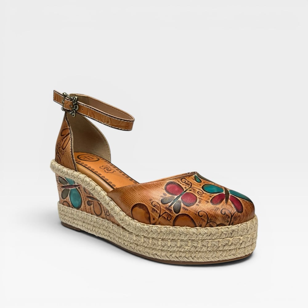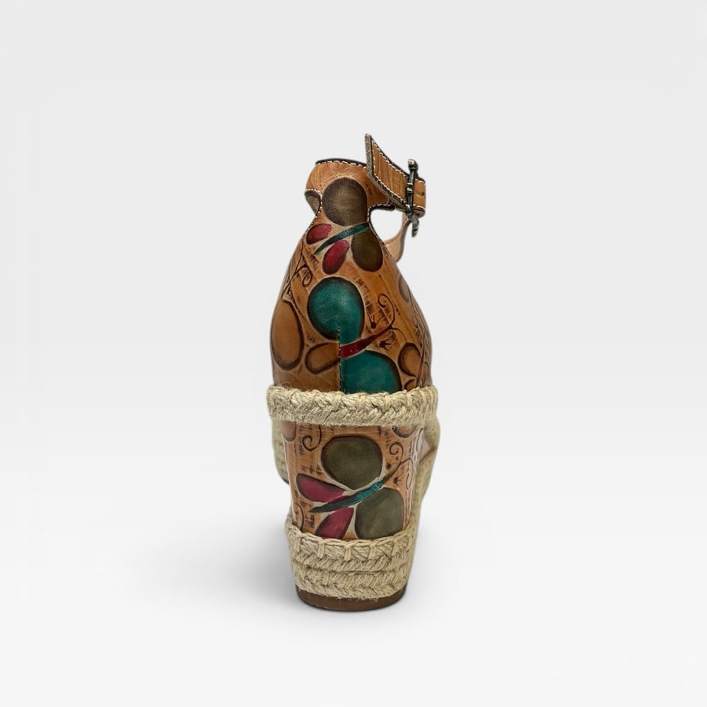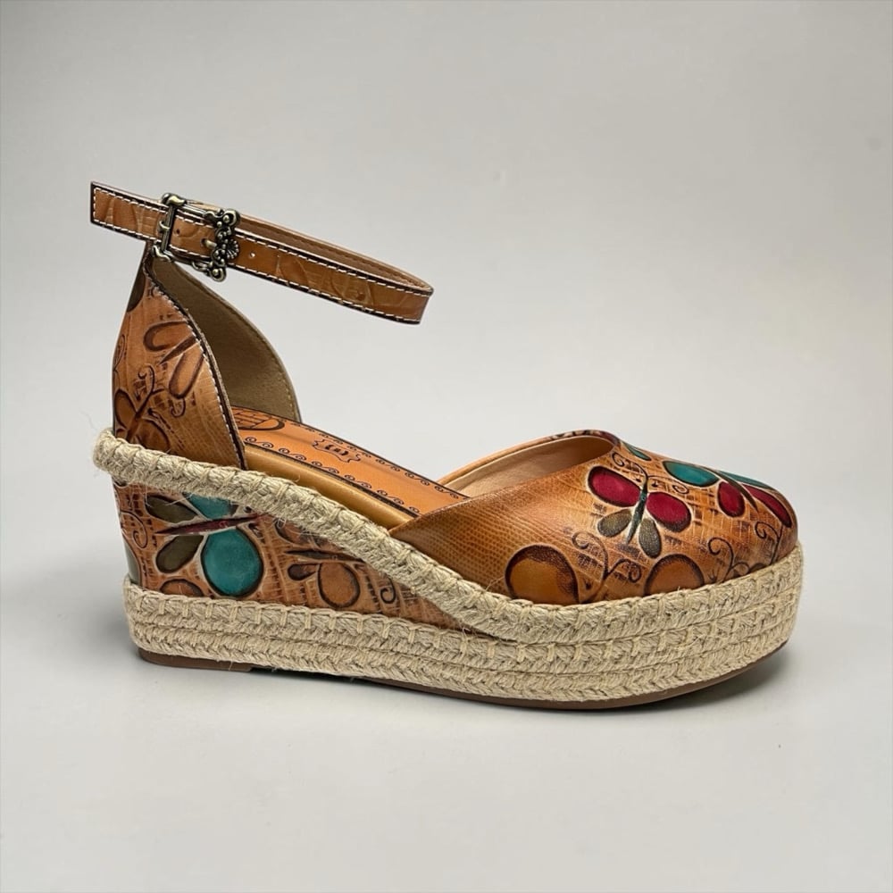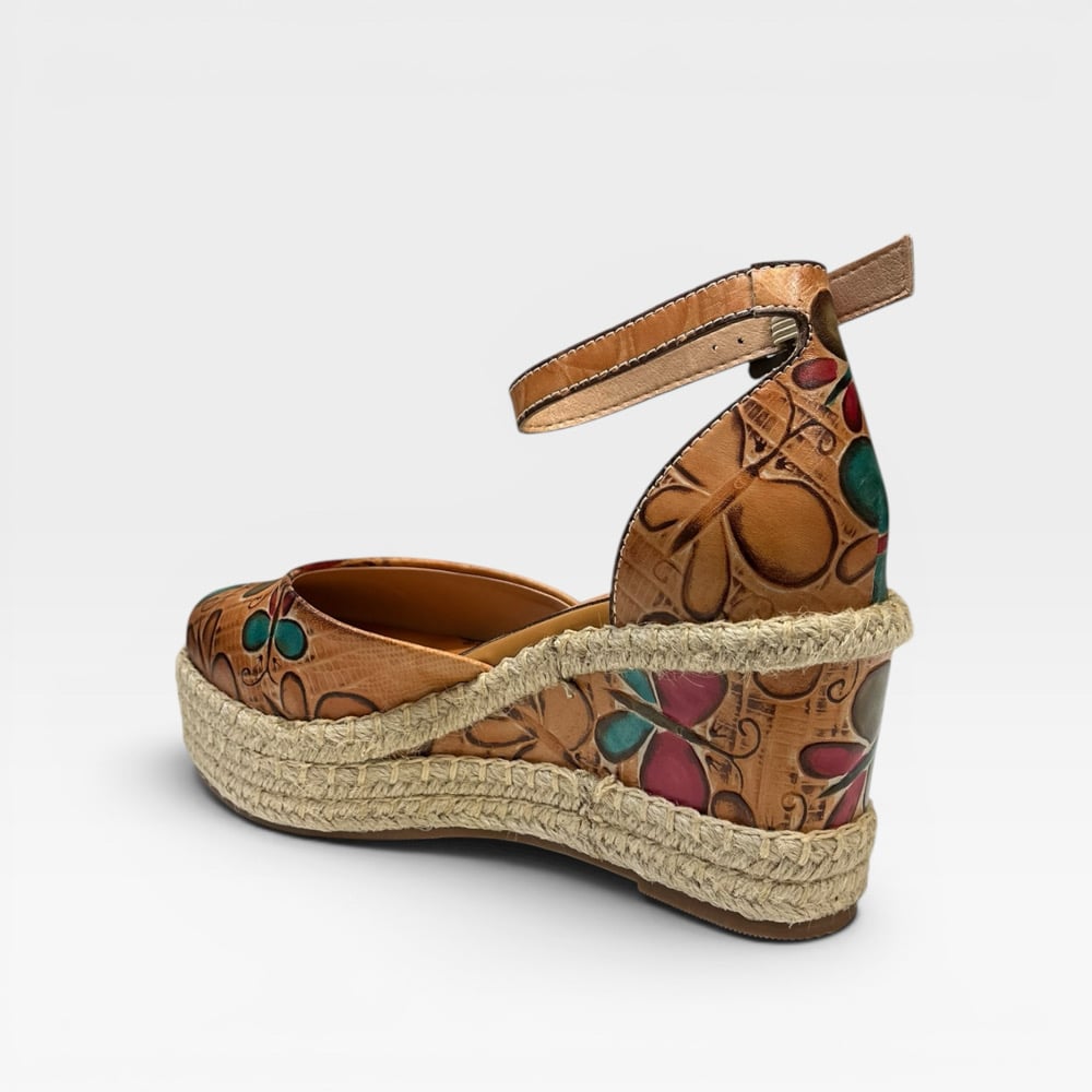 Leather upper. Leather lined. Rubber outsole. Adjustable ankle strap. 3” wedge. 1” platform. $170