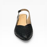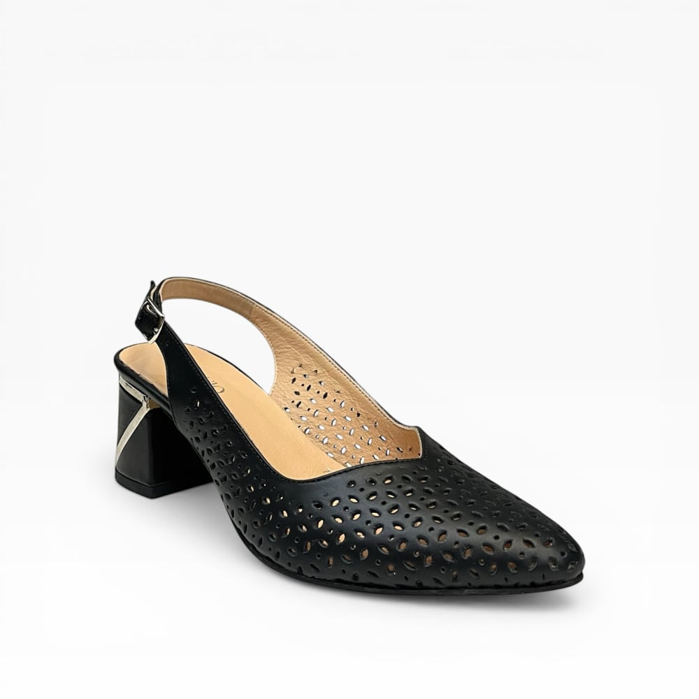Leather upper. Leather lined. Synthetic outsole. 2.5” heel height. Adjustable back strap. $175