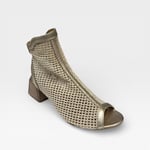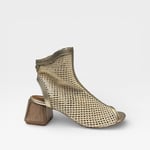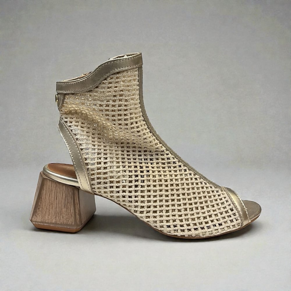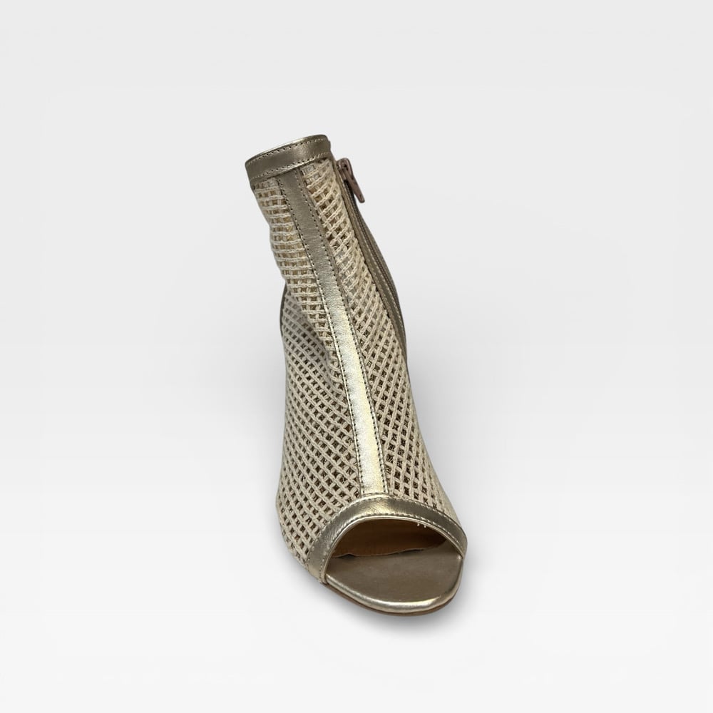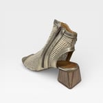 Leather/ Knit upper. Leather lined. Inside zipper. 2” heel height. Handmade in Poland. Synthetic outsole. $265