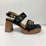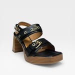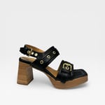 Leather upper. Leather lined. PU outsole with runner over top. Adjustable straps. 3” heel height 1” platform.