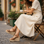 Leather upper. Leather lined. 3” wedge heel height 1” platform. PU outsole. Adjustable straps