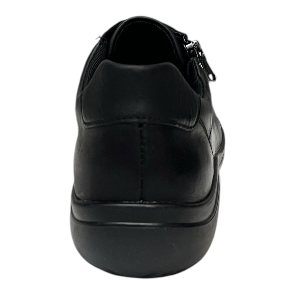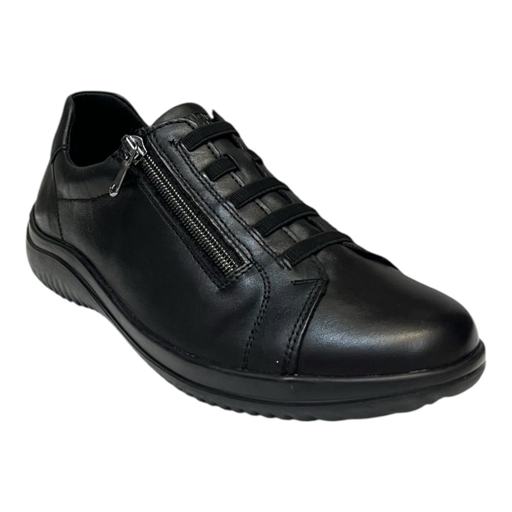 Leather upper. Polyester lined. Rubber outsole. Outside zipper. Stationary elastic laces.