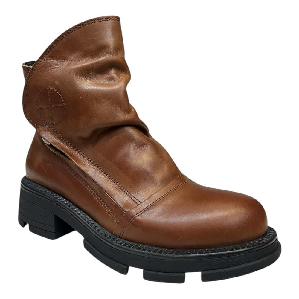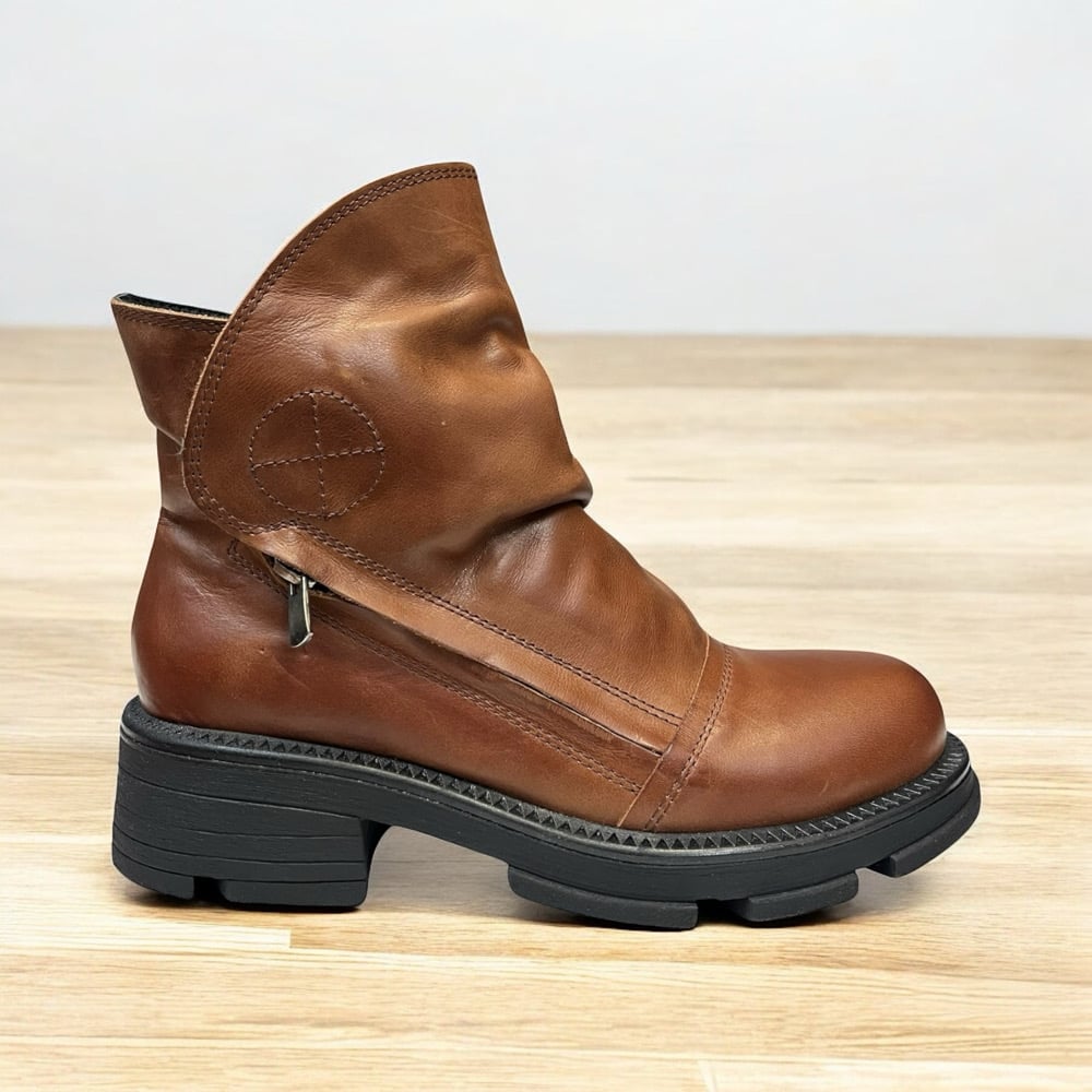 Soft Leather upper. Leather insole. Double entry zippers. Polyester lining. Rubber unit sole. Removable insole.